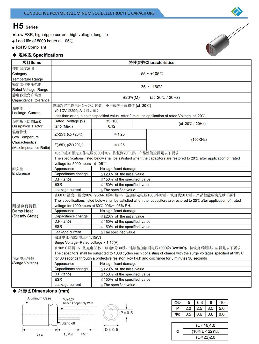 ● Low ESR, high ripple current, high voltage, long life ● Load life of 5000 hours at 105℃ ● RoHS Compliant