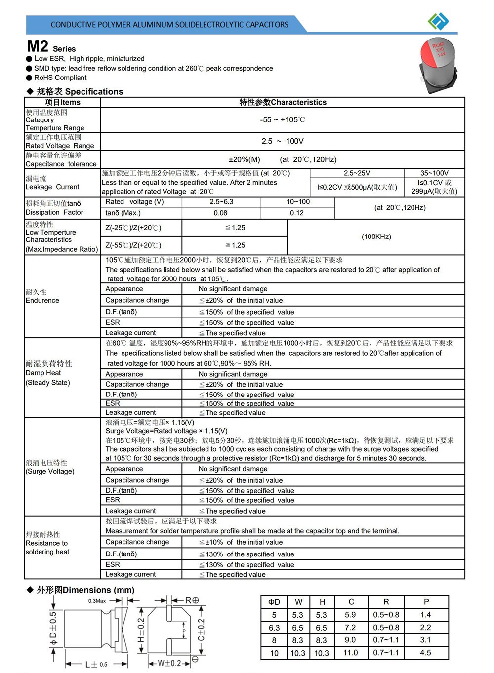 ● Low ESR, High ripple, miniaturized ● SMD type: lead free reflow soldering condition at 260℃ peak correspondence ● RoHS Compliant