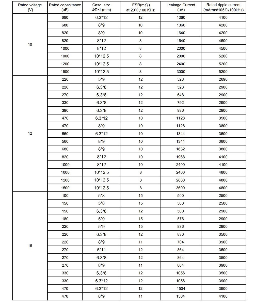 ● Super low ESR, high ripple current ● Load life of 2000 hours at 105℃ ● RoHS Compliant